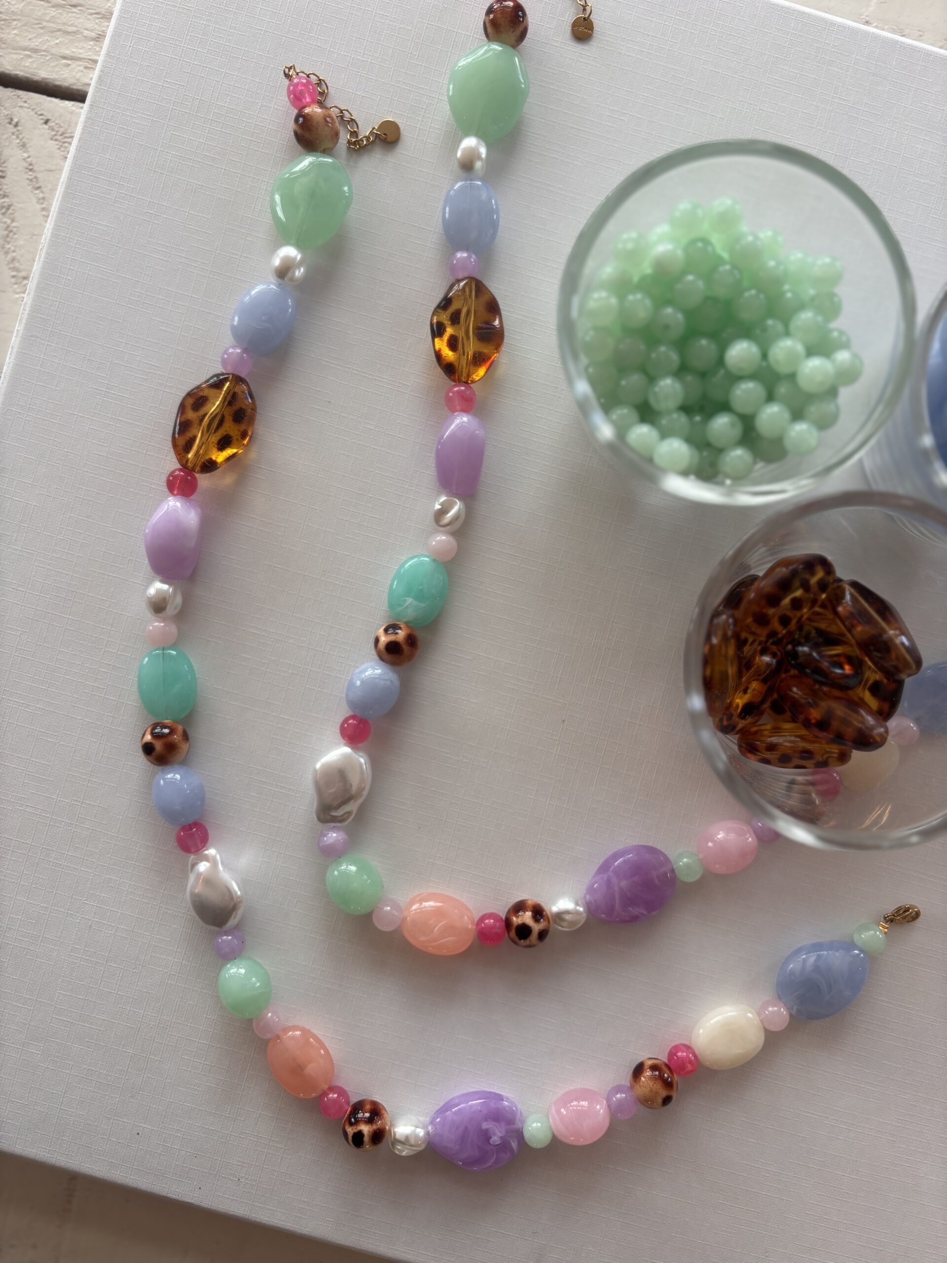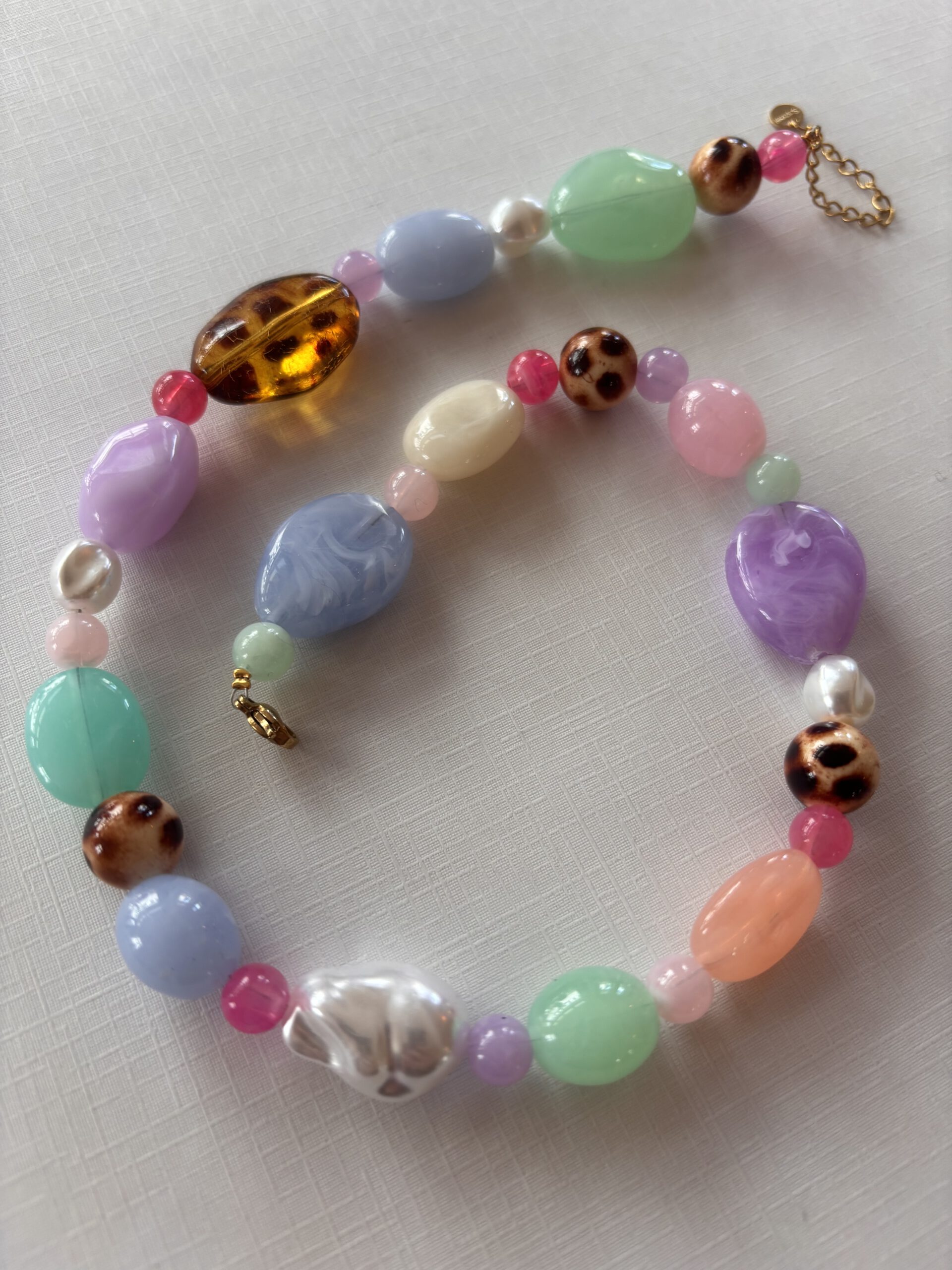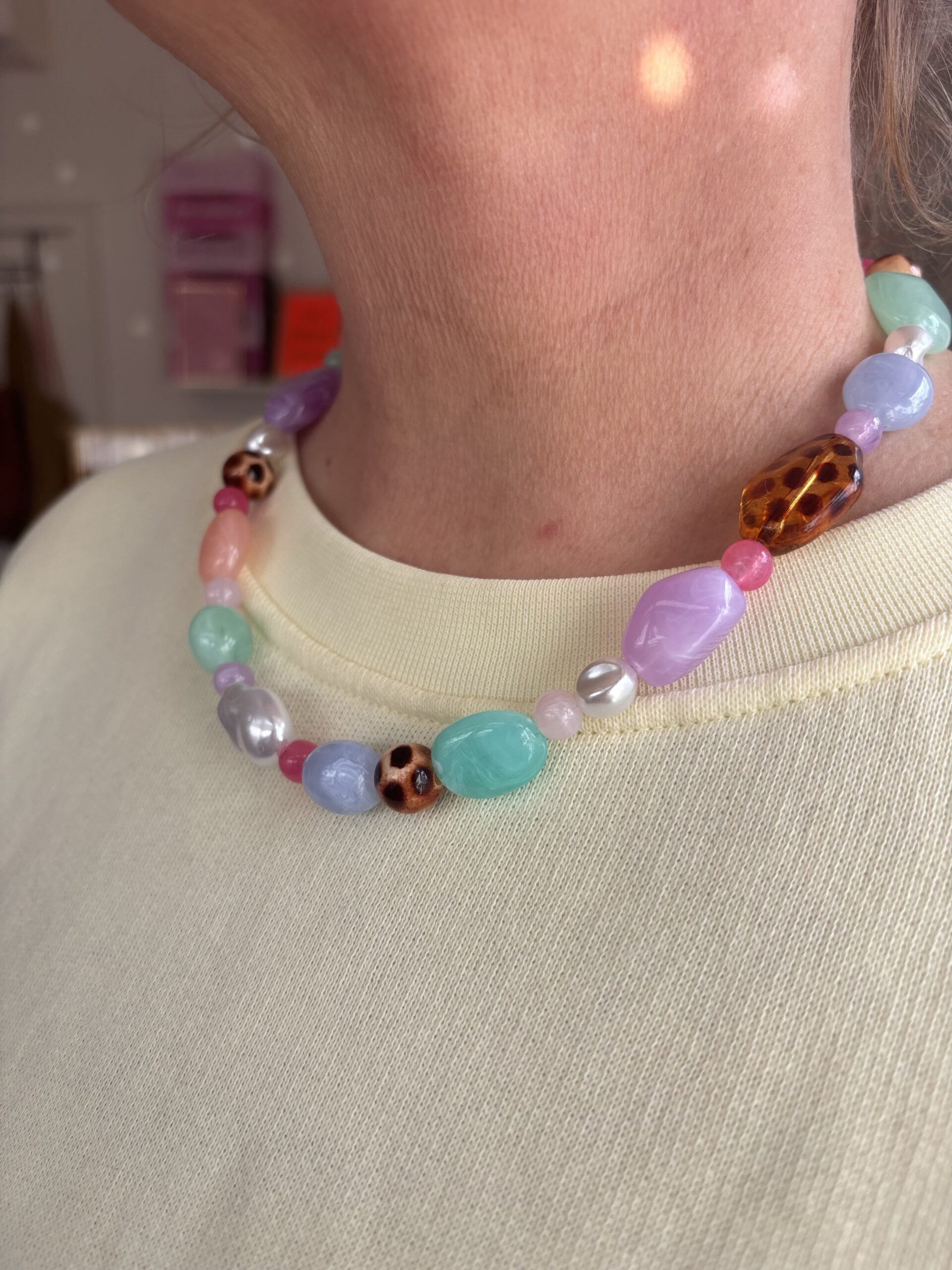 Een bonte verzameling van gekleurde acrylkralen en glasparels. Geweldige ketting om te dragen op een simpele basic.